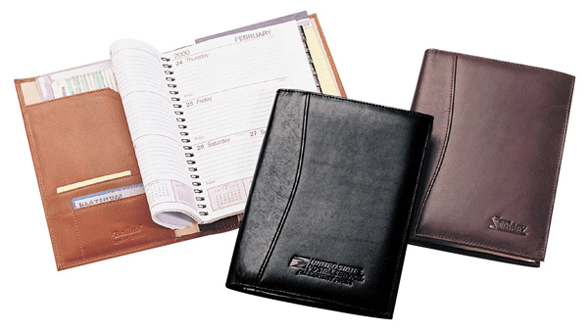 Leather planners and calendar covers come in a variety of colors, materials and sizes. Many are available to customize with your company's logo, name or initials.