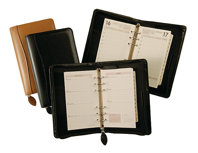 Stitched padded covers with exterior pocket. 1 1/2" capacity three-ring binder - for standard 5 1/2 x 8 1/2 Preference Brand or McCarthy Planner Inserts. Gusseted interior pocket. 6 business/credit card pockets. ID window accommodates optional calculator. Elastic pen loops and micro-perfed ruled pad. Includes Monthly/Weekly Refill Calendar Insert.