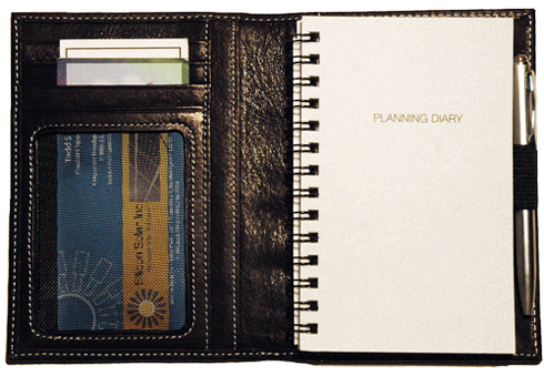 Our 5 1/8" x 3 7/8" x 1/2" small pocket planner has a choice of either a weekly calendar, journal or address book insert included. Gunmetal mini pen is included. ID holder, 3 card slots and 2 document pockets inside front cover, and a pocket on back cover.
