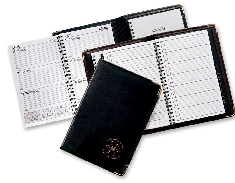 9" x 6" foam-padded covers. Black moiré vinyl lining. Rounded metal corners. 8" x 5" wirebound monthly/weekly planner. 8" x 5" wirebound tabbed phone/address book insert.