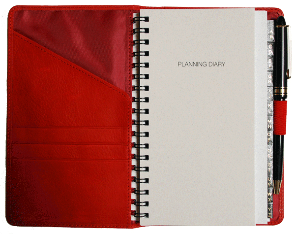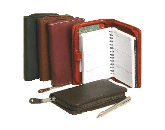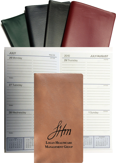 6 3/4" x 3 3/4", Supple softhide vinyl, Sealed covers. Two-color planner insert. Monthly format.