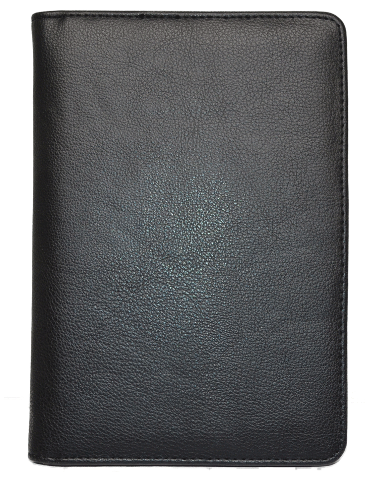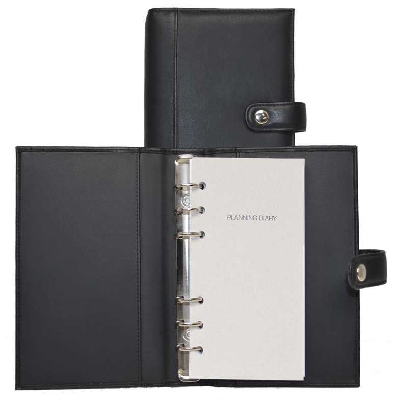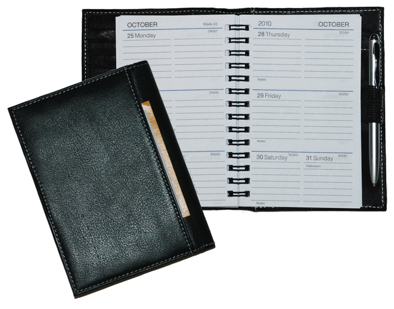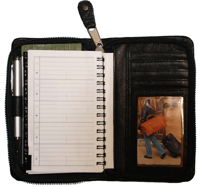 Our 5 1/8" x 3 7/8" x 1/2" small pocket planner has a choice of either a weekly calendar, journal or address book insert included. Gunmetal mini pen is included. ID holder, 3 card slots and 2 document pockets inside front cover, and a pocket on back cover.