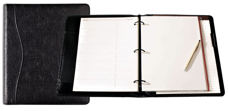 Includes a week-on-two-pages planning calendar, 13-step indexed phone/address book, 8 1/2" x 11" pad on back, to-do list and priority planner. Measures 10 1/4" x 11 1/2". 1 1/4" capacity rings. Pen loop (pen not included).