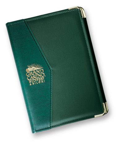 8 1/8" x 5 3/4" x 7/8" textured polyurethane cover with perimeter stitching. Matching fabric lining, multiple inside pockets and elastic pen loop (no pen included). Refills available for $7.95.